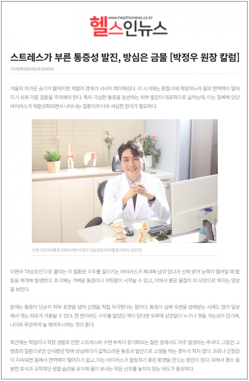 스트레스가 부른 통증성 발진, 방심은 금물 [박정우 원장 칼럼]