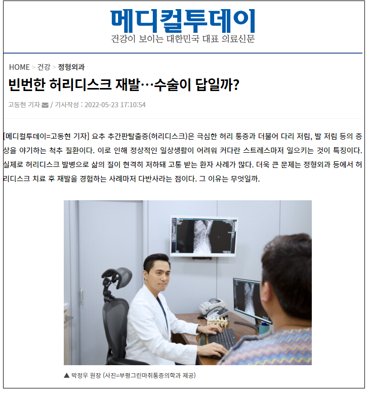 통증, 가만히 방치하지마세요. 전문의 3인 협진진료 부평그린마취통증의학과에서