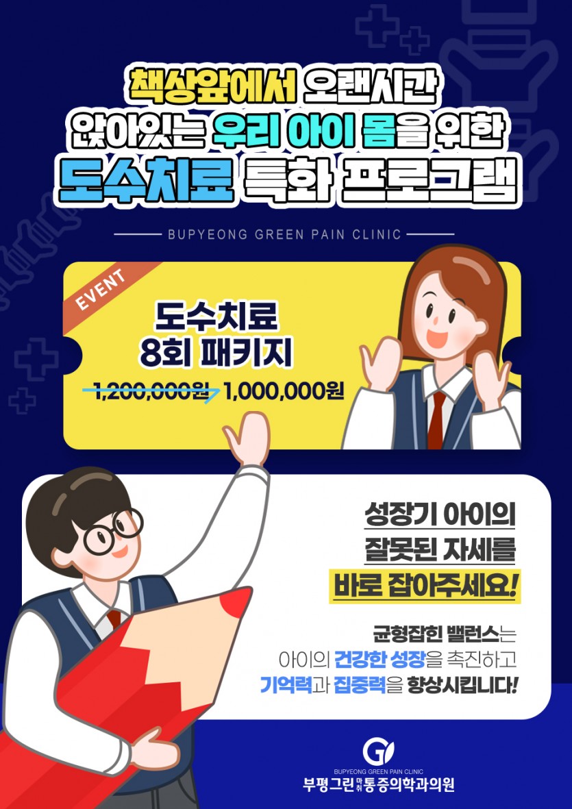 [공지사항] 책상 앞에서 오랜시간 앉아있는 우리 아이 몸을 위한 도수치료 특화 프로그램 작성일 : 2022.09.23 부평그린마취통증의학과 댓글 : 0 조회 : 2,185 책상 앞에서 오랜시간 앉아있는 우리 아이 몸을 위한 도수치료 특화 프로그램 성장기 아이의 잘못된 자세를 바로 잡아주세요! 균형잡힌 밸런스는 아이의 건강한 성장을 촉진하고 기억력과 집중력을 향상시킵니다!