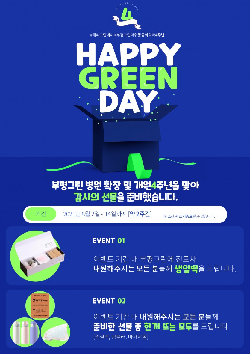[공지사항] 부평그린마취통증의학과 병원확장 및 개원 4주년 기념 이벤트를 준비했습니다~ 작성일 : 2021.07.26 부평그린마취통증의학과 댓글 : 0 조회 : 2,972 많은 분들의 사랑과 관심 덕분에 이렇게 부평그린이 4주년을 맞이하였습니다. 저희 부평그린을 찾아주시는 많은 분들에게 보답하고자 이렇게 이벤트를 준비하였으니 많은 참여과 관심 부탁드립니다. 감사합니다:-)