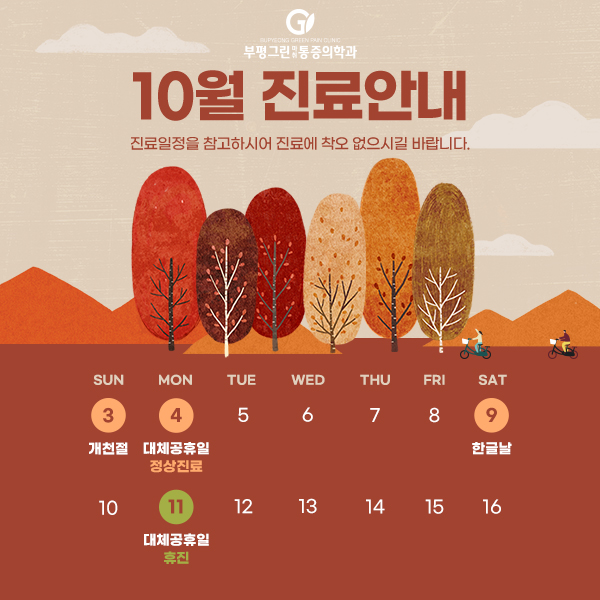 [공지사항] 10월 진료안내 작성일 : 2021.09.27 부평그린마취통증의학과 댓글 : 0 조회 : 2,922 10월 진료안내입니다. 진료일정을 참고하여 진료에 착오 없으시길 바랍니다.