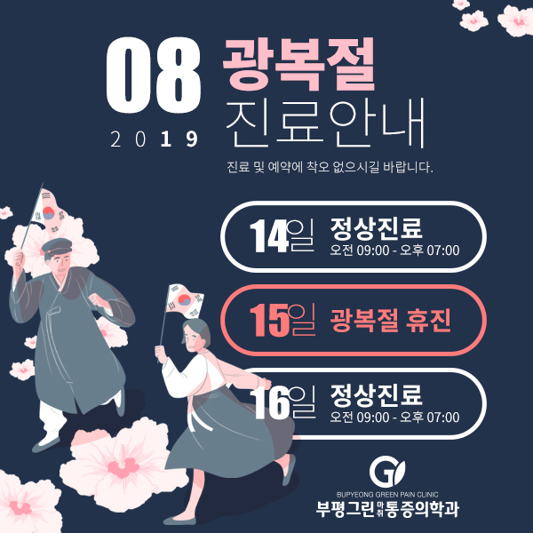 [공지사항] 2019년 8월 [광복절] 진료안내 작성일 : 2019.07.30 부평그린마취통증의학과 댓글 : 0 조회 : 3,090 부평그린마취통증의학과는 나라찾은 노고에 감사드리며, 존경과 예우를 표합니다. 2019년 8월 15일 진료 휴진입니다. 진료와 예약에 착오없으시길 바랍니다. 감사합니다:)