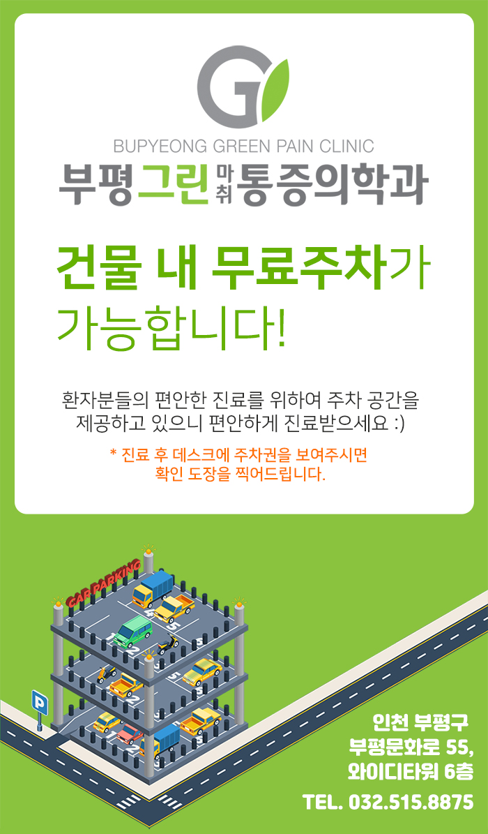 [공지사항] 건물내 주차 안내드립니다-! 작성일 : 2019.05.15 부평그린마취통증의학과 댓글 : 0 조회 : 3,189 안녕하세요. 부평그린마취통증의학과입니다. 건물내 무료주차가 가능하며, 진료 후 데스크에서 주차권을 보여주시면 확인 도장을 찍어드립니다. 환자분들의 편안한 진료를 위하여 주차 공간을 제공하고 있으니 편안하게 진료 받으세요 :)
