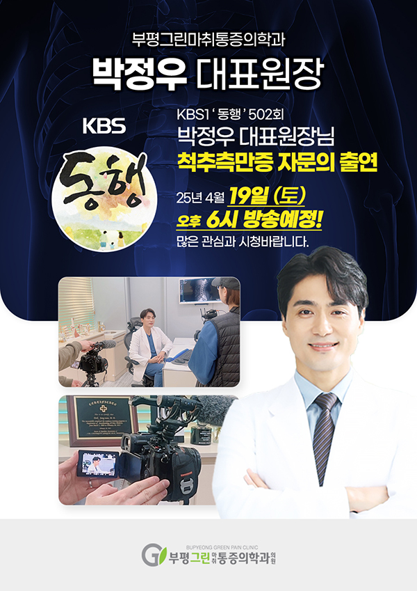 [공지사항] 4월 19일 KBS 동행 '502회' 척추측만증 자문의 출연 작성일 : 2025.05.26 부평그린마취통증의학과 댓글 : 0 조회 : 690 4월 19일 KBS 동행 '502회' 척추측만증 자문의 출연