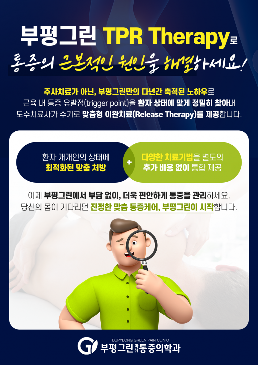 [공지사항] 부평그린 TPR Therapy로 통증의 근본적인 원인을 해결하세요! 작성일 : 2025.05.26 부평그린마취통증의학과 댓글 : 0 조회 : 873 부평그린 TPR Therapy로 통증의 근본적인 원인을 해결하세요! 주사치료가 아닌, 부평그린만의 다년간 축적된 노하우로 근육 내 통증 유발점(trigger point)을 환자 상태에 맞게 정밀한 찾아내 도수치료사가 수기로 맞추형 이완치료(Release Therapy)를 제공합니다.